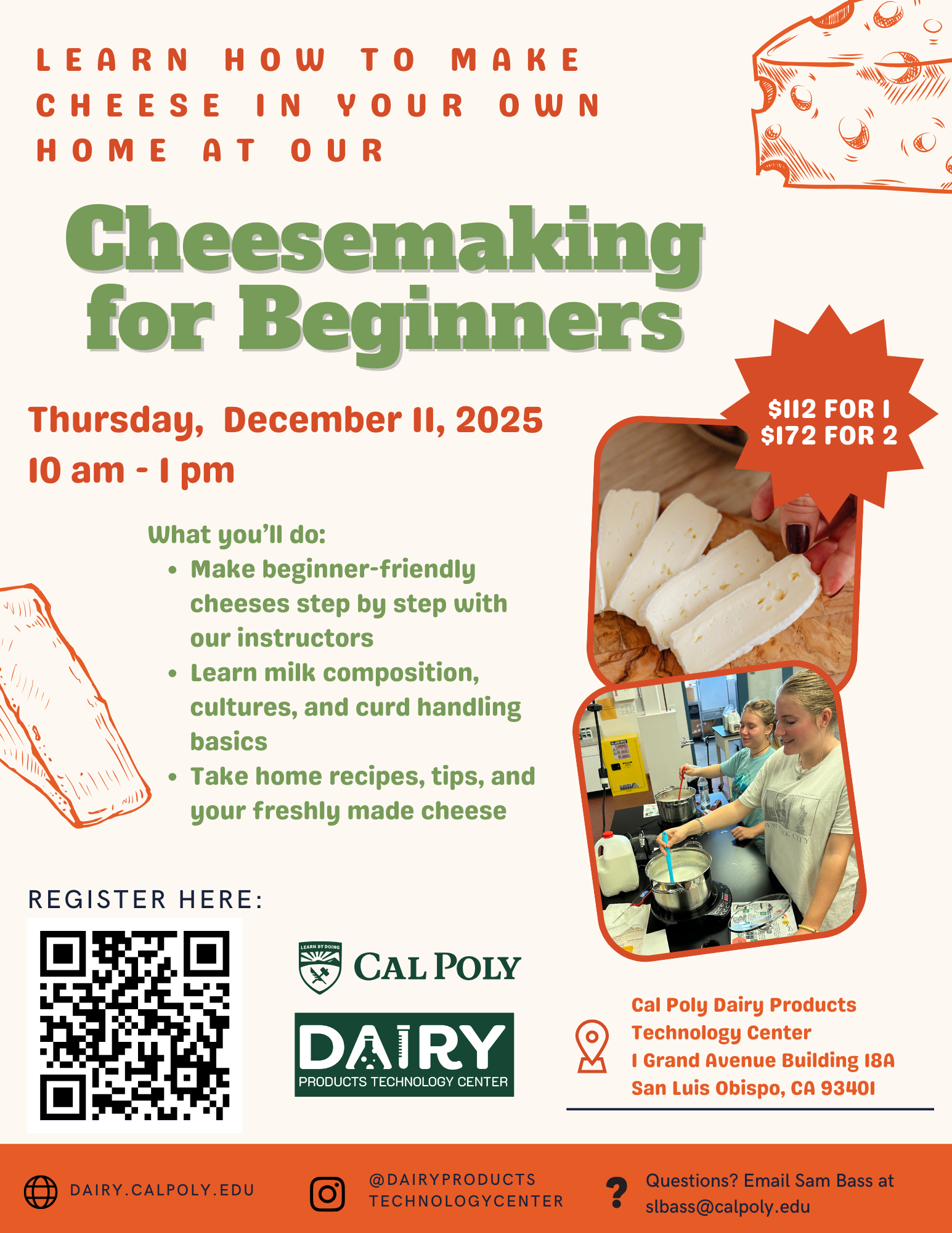 Discover the joy of making cheese right in your own kitchen! In this hands-on, half-day workshop, participants will learn the fundamentals of cheesemaking — from understanding how milk transforms into curds and whey to crafting their own fresh cheese.