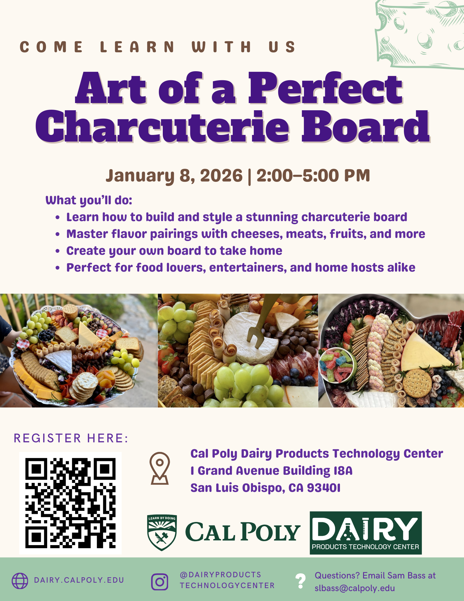 Elevate your next gathering with a stunning and delicious charcuterie board! In this interactive half-day workshop, Isa Iturriria — Cal Poly alum and founder of Boards by Isa — will guide participants through the essentials of creating a beautifully balanced board.